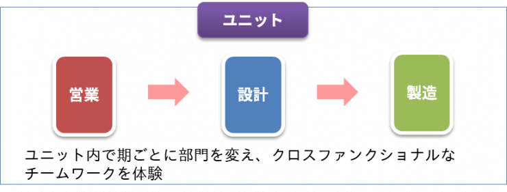Ⅰ期〜Ⅳ期の各期毎にユニット内でローテーションをおこない、役割ごとに目線を変えながら作業を進める事で、仕事の全体像や工程について理解し、最終的にお客様に満足してもらえる製品を創り上げることを目指します。